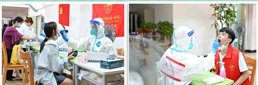 此次到现场为师生开展核酸检测的12名医护人员均来自暨南大学附属第一医院广州华侨医院。为了在最短时间内阻断病毒传播途径、切断感染链条,医护人员坚守在核酸采集一线,一丝不苟地为每个受监测者采样。他们在近期已是第五次接受“召集令”,马不停蹄出战支援学院开展核酸检测工作。炎热的天气,加上厚重的防护服,汗水很快就浸湿了衣服,但他们不言苦累,一直奋战到核酸检测工作结束。