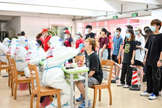 排队、录入信息、咽拭子采样,在集中采样点,师生员工全程佩戴口罩,自觉间隔一米,按10人一组分批分次有序前往采样区,开设10条通道,在现场医护人员的引导下,有序进行核酸检测的采样。